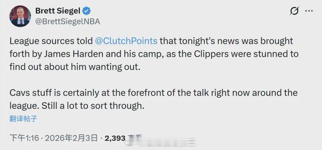 名记Siegel对此表示,是哈登主动申请交易,快船虽然很震惊但也同意了。