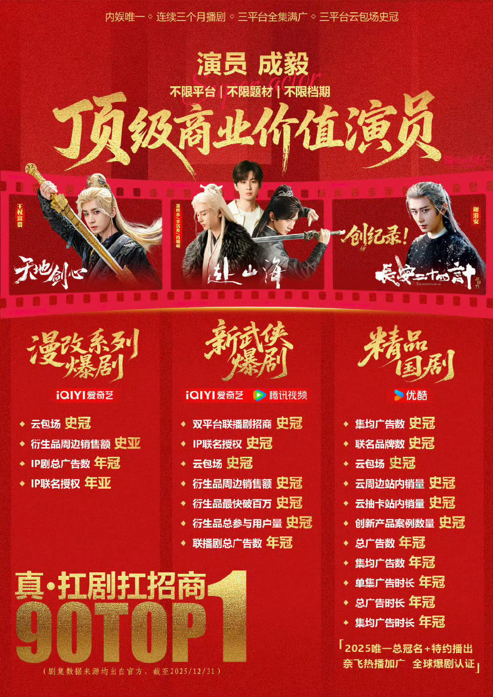 成毅三剧入围微博剧集讨论榜,《赴山海》《长安二十四计》《天地剑心》三部剧2025微博剧集讨论榜TOP5!