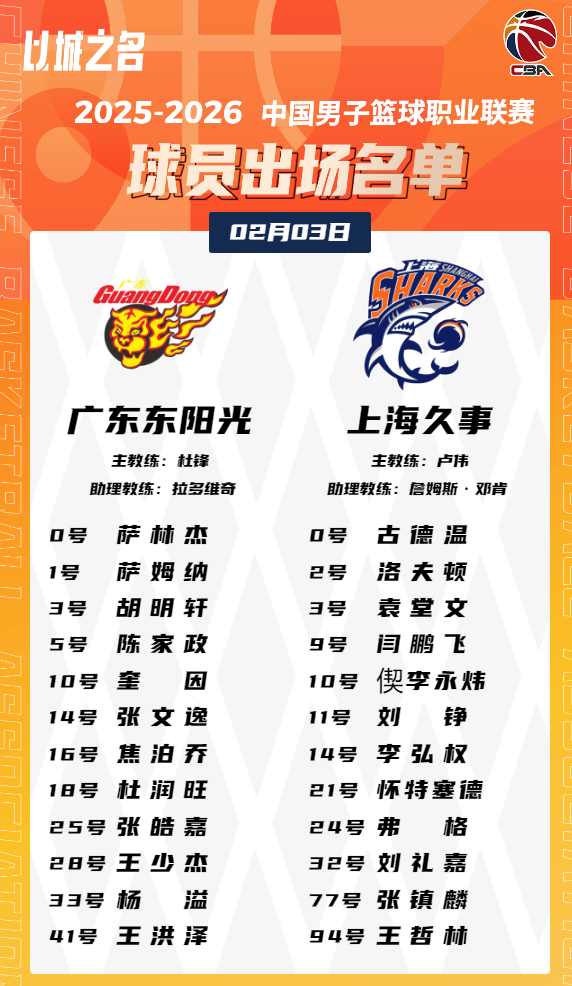 虎扑02月03日讯今晚CBA常规赛,广东对阵上海的大名单已经公布。