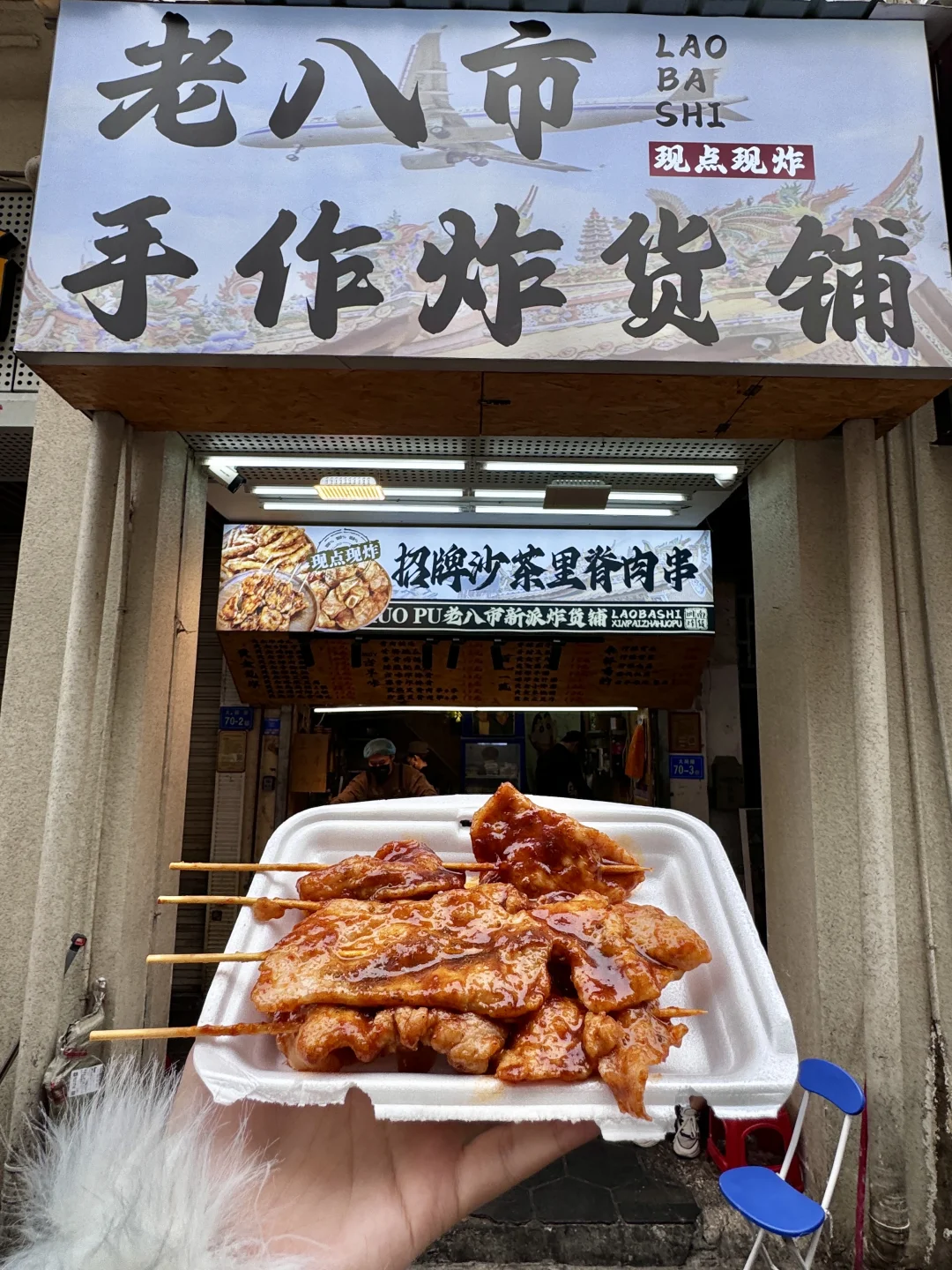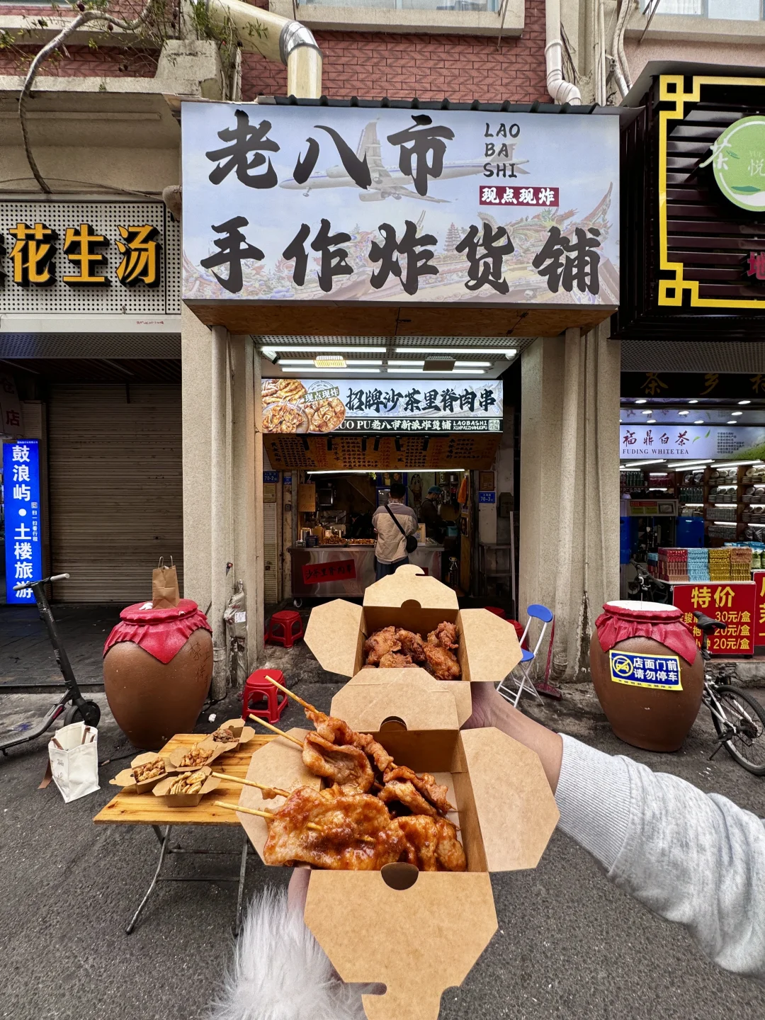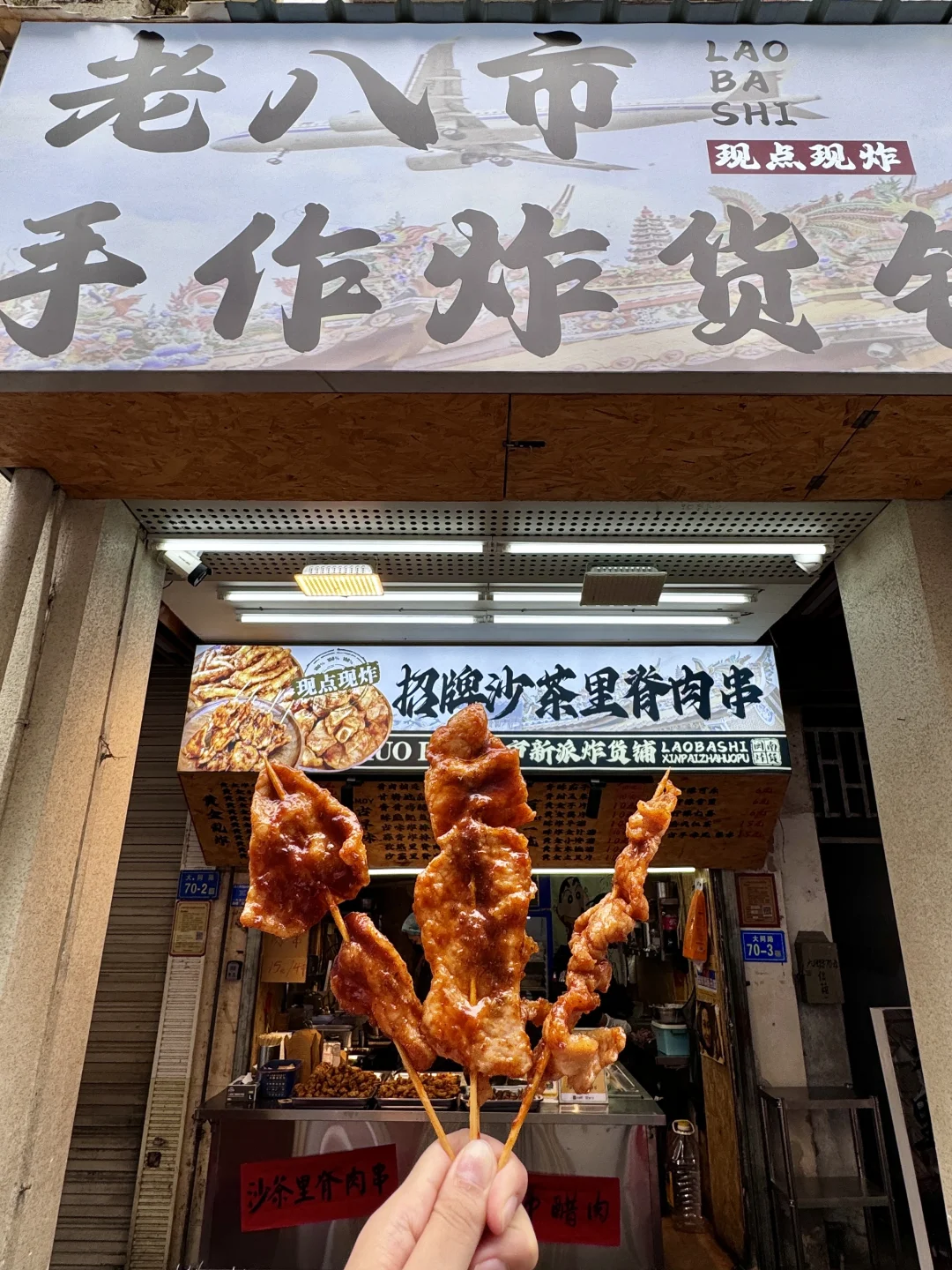 谁懂啊!在八市逛吃,居然被这家手作炸货店拿捏了🤤 现点现裹粉、现炸出锅,不是那种预制半成品,油锅里滋啦滋啦的声音,路过就走不动道了! ✅沙茶里脊肉串 里脊肉超嫩!裹着沙茶酱炸得外酥里嫩,咬开还带着肉汁,甜咸口完全是厦门人爱的味道。 ✅闽南炸醋肉 外酥里嫩,带着淡淡的醋香,一点不腻,空口吃都能炫半份 ✅菜丸子 外脆里糯,蔬菜香气很浓,口感QQ的,配炸肉吃解腻绝了 · 店就在八市入口附近,逛海鲜市场顺路就能炫一份,完美适配逛吃节奏! 📍店名:老八市手作炸货铺