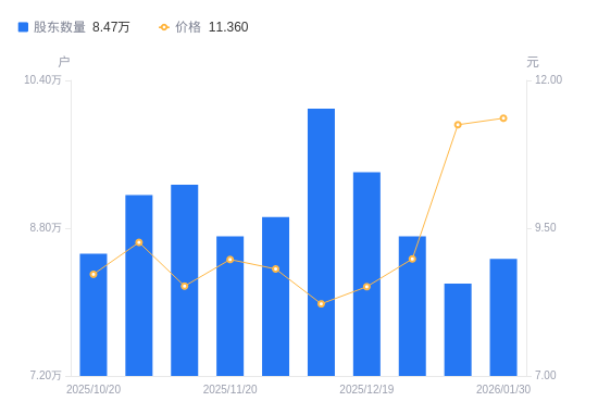 日期A股户数(户)流通A股户均持股数(股)户均持股市值(万元)2026-01-308467295362.56108.332026-01-208200698462.78110.772025-12-318710692697.8583.242025-12-199407085835.4373.052025-12-1010094279991.8665.752025-11-288919390528.8479.762025-11-208711792686.1483.142025-11-109271087094.5874.202025-10-319160088149.9881.632025-10-208522194748.2382.62