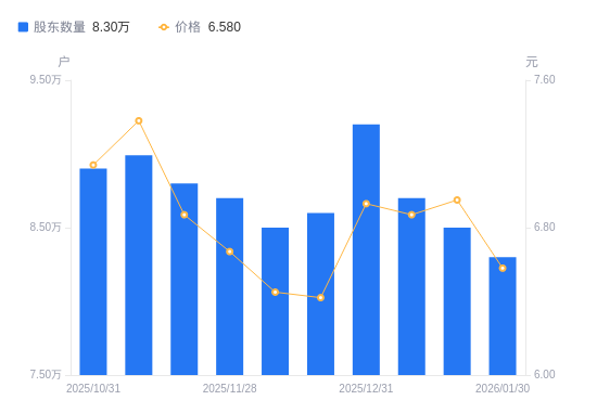 日期A股户数(户)流通A股户均持股数(股)户均持股市值(万元)2026-01-308300020634.1713.582026-01-208500020148.6614.002026-01-098700019685.4713.522025-12-319200018615.6112.902025-12-198600019914.3712.792025-12-108500020148.6613.002025-11-288700019685.4713.132025-11-208800019461.7713.372025-11-108990019050.4614.062025-10-318900019243.1013.74