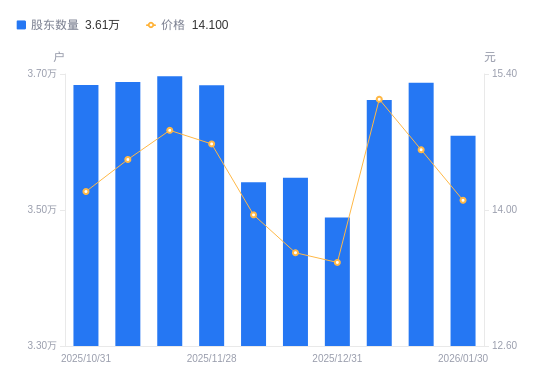 日期A股户数(户)流通A股户均持股数(股)户均持股市值(万元)2026-01-30360927108.7610.022026-01-20368736958.1910.172026-01-09366197006.4610.612025-12-31348887354.099.902025-12-19354747232.609.812025-12-10354087246.0910.112025-11-28368336965.7510.232025-11-20369676940.5010.292025-11-10368836956.3010.102025-10-31368376964.999.88
