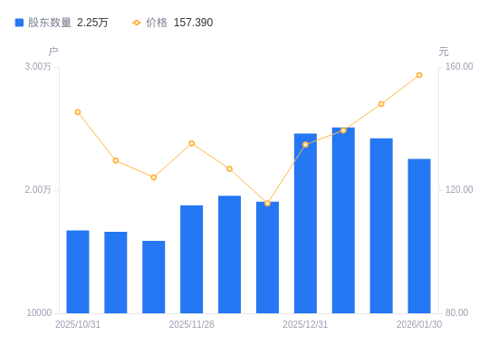 日期A股户数(户)流通A股户均持股数(股)户均持股市值(万元)2026-01-30225352607.0541.032026-01-20242152426.1835.912026-01-09250832342.2232.652025-12-31246032387.9232.192025-12-19190643081.7235.662025-12-10195482942.4937.342025-11-28187713064.2941.432025-11-20158823621.7044.972025-11-10166163461.7244.862025-10-31167243439.3649.99