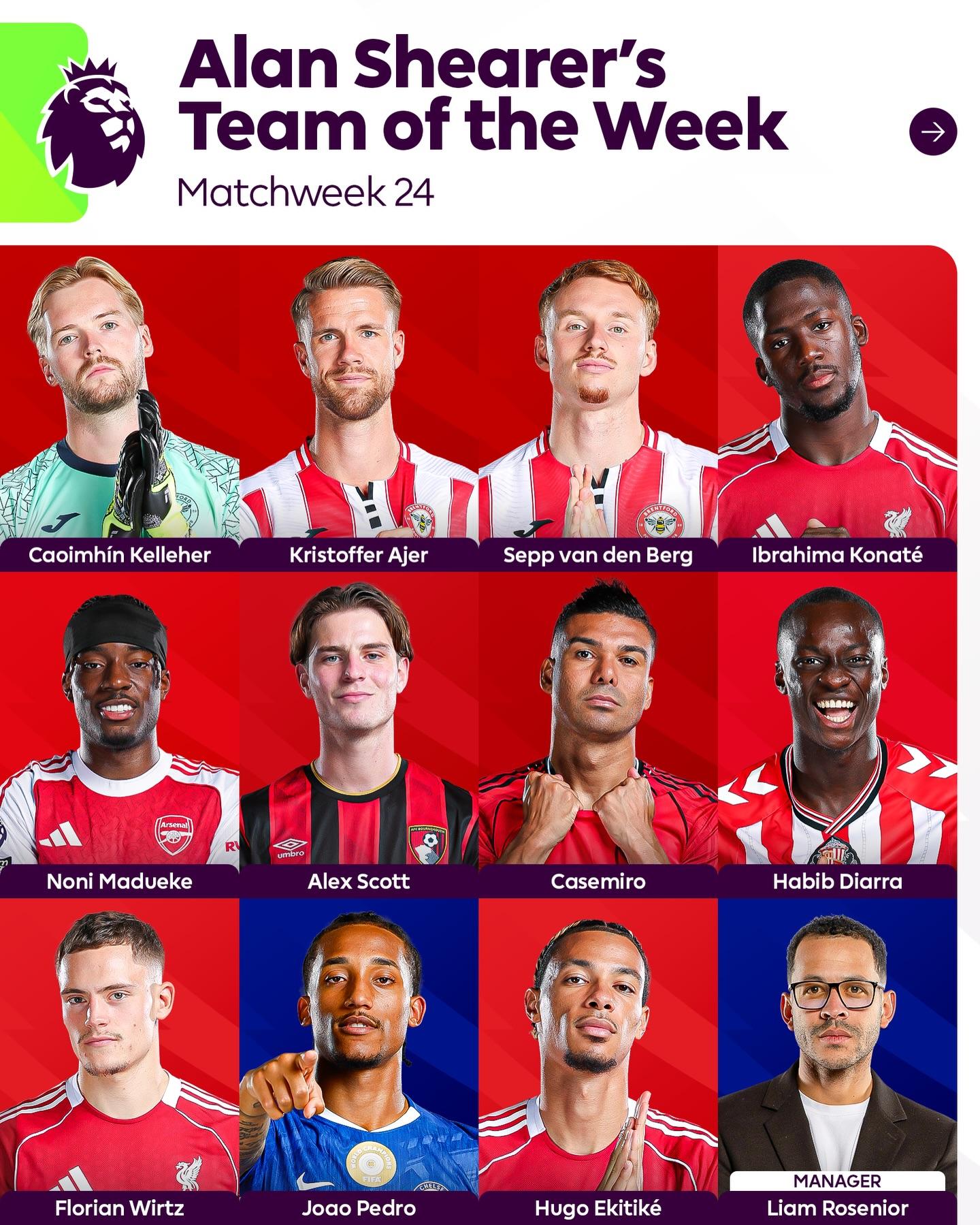 中场:马杜埃凯(阿森纳)、斯科特(伯恩茅斯)、卡塞米罗(曼联)、迪亚拉(桑德兰)