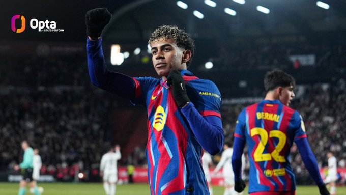 Opta数据统计,亚马尔在代表巴萨出战的近37场各项赛事中参与了33粒进球,其中包括18粒进球和15次助攻。