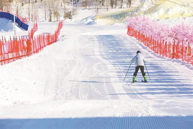 山巅滑雪出发区人头攒动,长长的雪板切开雪面,发出“滋啦”的脆响,雪沫子飞溅如碎玉。滑雪者腾空跃起,落地时稳稳一蹲,引来观赛区阵阵喝彩。这里的欢乐不止于滑雪,儿童嬉雪区里,冰雪爬犁、冰花转转与五颜六色的设施相映如画,孩子们在开雪地摩托、打雪仗、滚冰抽尜,这里成了最热闹的童真释放地。