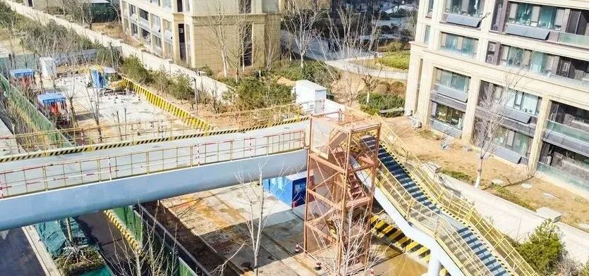 -位于济南青岛路首座人行天桥主体结构吊装到位。