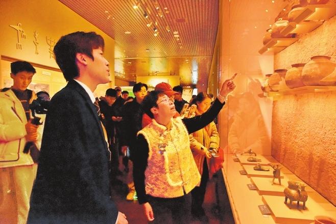 文化学者蒙曼(右一)在殷墟博物馆参观。彭捷摄