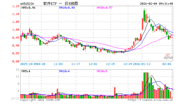 2月4日,软件ETF(515230)开盘跌1.04%,报0.950元。软件ETF(515230)重仓股方面,科大讯飞开盘跌1.20%,金山办公跌1.39%,同花顺跌0.66%,指南针跌0.60%,恒生电子跌0.98%,拓维信息跌0.66%,润和软件跌0.60%,三六零跌1.42%,深信服跌2.67%。