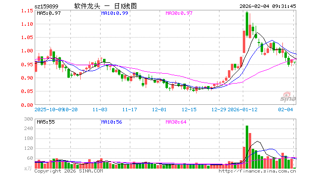 2月4日,软件龙头ETF(159899)开盘跌0.83%,报0.958元。软件龙头ETF(159899)重仓股方面,科大讯飞开盘跌1.20%,金山办公跌1.39%,同花顺跌0.66%,指南针跌0.60%,恒生电子跌0.98%,拓维信息跌0.66%,润和软件跌0.60%,三六零跌1.42%,深信服跌2.67%。