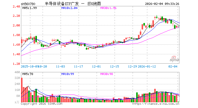2月4日,半导体设备ETF广发(560780)开盘跌1.01%,报1.965元。半导体设备ETF广发(560780)重仓股方面,北方华创开盘跌1.05%,中微公司跌0.97%,拓荆科技跌1.52%,长川科技跌1.27%,沪硅产业跌0.88%,华海清科跌0.89%,中科飞测跌0.04%,南大光电跌1.09%,安集科技跌1.40%,芯源微跌1.00%。