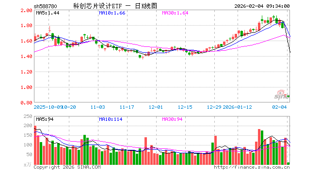 2月4日,科创芯片设计ETF(588780)开盘跌2.11%,报0.882元。科创芯片设计ETF(588780)重仓股方面,海光信息开盘跌1.30%,寒武纪跌2.48%,澜起科技跌3.53%,芯原股份跌1.00%,东芯股份跌1.34%,佰维存储跌2.37%,睿创微纳跌0.57%,晶晨股份跌0.13%,复旦微电跌1.05%,恒玄科技跌1.17%。