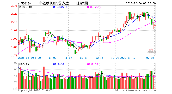 2月4日,科创成长ETF易方达(588020)开盘跌1.44%,报2.055元。科创成长ETF易方达(588020)重仓股方面,海光信息开盘跌1.30%,寒武纪跌2.48%,拓荆科技跌1.52%,源杰科技跌0.25%,九号公司涨0.18%,国盾量子跌0.63%,仕佳光子跌2.17%,思特威跌0.69%,百利天恒跌0.71%,铂力特跌0.80%。