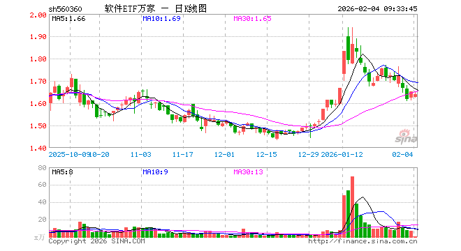 2月4日,软件ETF万家(560360)开盘跌1.51%,报1.627元。软件ETF万家(560360)重仓股方面,科大讯飞开盘跌1.20%,金山办公跌1.39%,同花顺跌0.66%,指南针跌0.60%,恒生电子跌0.98%,拓维信息跌0.66%,润和软件跌0.60%,三六零跌1.42%,软通动力跌1.09%。