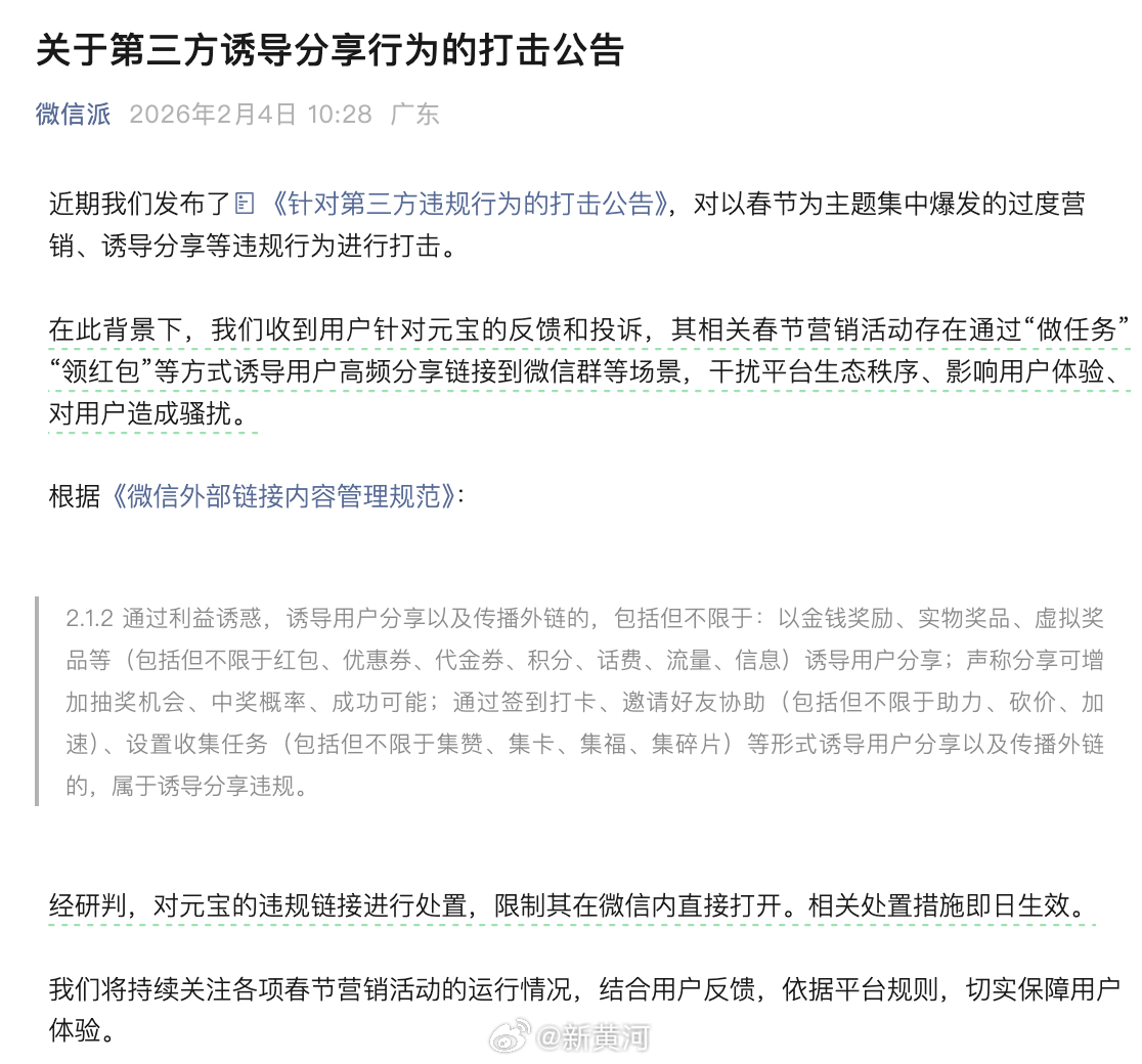 “在此背景下,我们收到用户针对元宝的反馈和投诉,其相关春节营销活动存在通过“做任务”“领红包”等方式诱导用户高频分享链接到微信群等场景,干扰平台生态秩序、影响用户体验、对用户造成骚扰。”