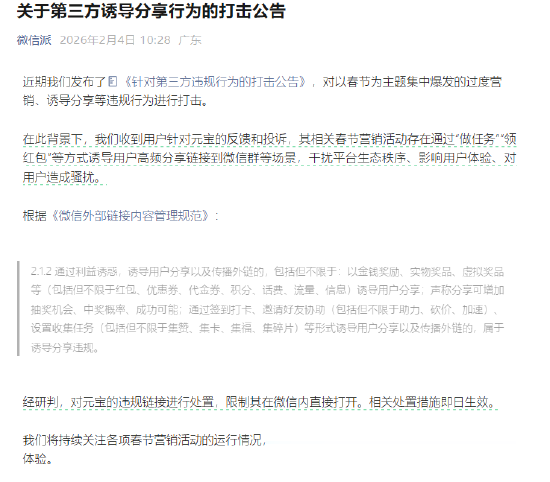 随后,微信官方发布声明称,收到用户针对元宝的反馈和投诉,其相关春节营销活动存在通过“做任务”“领红包”等方式诱导用户高频分享链接到微信群等场景,干扰平台生态秩序、影响用户体验、对用户造成骚扰。经研判,对元宝的违规链接进行处置,限制其在微信内直接打开。相关处置措施即日生效。
