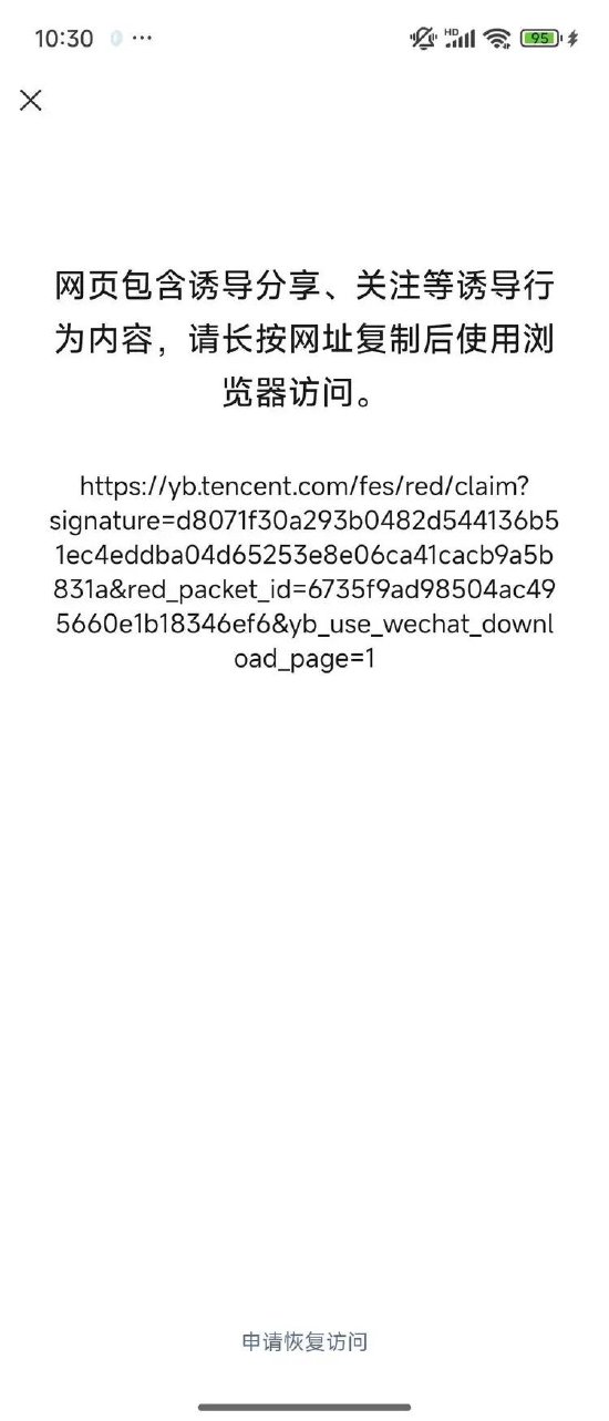 2月4日,社交平台上不少用户反馈称,在微信群里转发的元宝红包链接,已经无法直接点开访问。页面弹出提示:网页包含诱导分享、关注等诱导行为内容,请长按网址复制后使用浏览器访问。