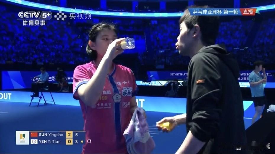 莎莎今天也穿上新的比赛服了,很好看。 亚洲杯比赛今天开始了,莎莎和叶伊恬的比赛是在一号台,莎莎今天的场外是马琳。今天现场看比赛的人比较多,看到莎莎指了好几次看台,应该是有闪光灯。 这个台北小将打的也很不错,第一局两个人都需要适应对方,叶伊恬的场外是老庄,第一局莎莎是11-8赢下,大比分1-0领先。到了第二局比赛,莎莎已经解题了,以101-3拿下,大比分2-0领先,第二局莎莎在发球上有了变化。今年新的比赛服挺好看的,莎莎穿上更萌了,但是赛场上的莎莎打球很凶。 比赛来到第三局,两个人打开了,但是莎莎的实力还是远超叶伊恬的,看到老庄在场外看球看得很认真。刚刚比赛期间听到观众席有个女的一直在尖叫瞎喊,确实也有些影响运动员的发球和专注力了。第三局莎莎比分5:3领先时,老庄叫了暂停,再不用暂停就没机会了,老庄看着比以前瘦了,看来老庄现在是中国台北队的教练了。刚刚看到莎莎的高抛发球了,看来这段时间莎莎在发球上也下功夫了,莎莎以10-4拿到赛点,叶伊恬是连续挽救了3个赛点。莎莎最终是以11-7拿下第三局,大比分3-0赢了,接下来的比赛莎莎继续加油哦!