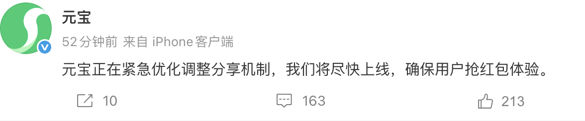 元宝方面随后在微博回应称,正在紧急优化调整分享机制,将尽快上线,以确保用户抢红包体验。
