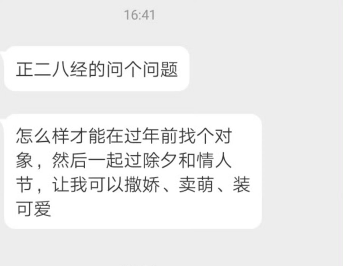 【还有半个月 怎么才能在过年前找到对象】小美,我正儿八经地问下:怎么才能在过年前找到男朋友?然后一起过情人节和除夕春节,让我可以撒娇、卖萌、装可爱? 当今年情人节遇上春节