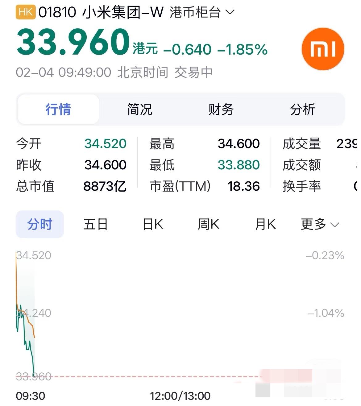 AUV,小米股价又跌啦,都跌破34港元了!看着这天天跌的走势,真佩服那些持股不动