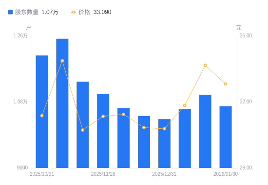 近一年(2025年1月31日至2026年1月30日),欣灵电气A股股东户数从9865户,增加至1.07万户,增幅8.26%,区间股价上涨43.74%。