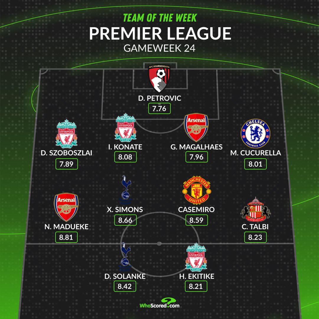 WhoScored本轮英超最佳阵容:利物浦三将领衔,马杜埃凯在列