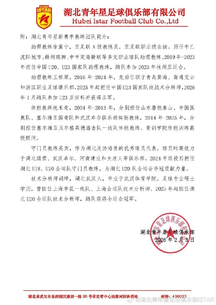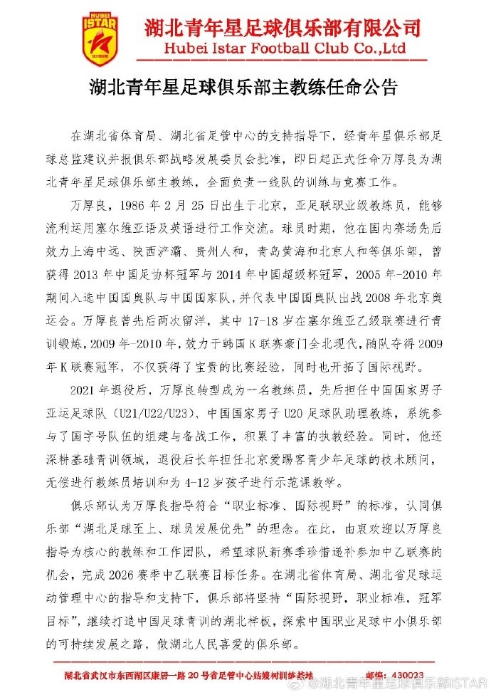 直播吧2月4日讯中乙湖北青年星官方消息,万厚良出任球队主教练,徐冀宁、王栋梁出任助理教练,托米奇出任体能教练、吴龑出任守门员教练、胡琦出任技术分析师。