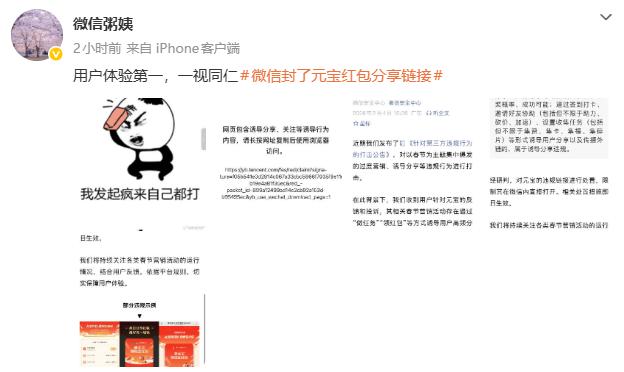 在此背景下,我们收到用户针对元宝的反馈和投诉,其相关春节营销活动存在通过“做任务”“领红包”等方式诱导用户高频分享链接到微信群等场景,干扰平台生态秩序、影响用户体验、对用户造成骚扰。