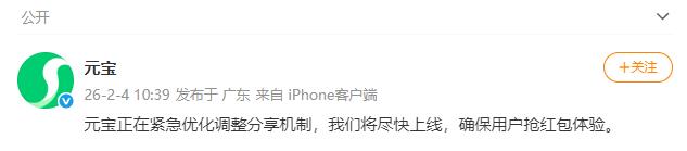 元宝正在紧急优化调整分享机制,我们将尽快上线,确保用户抢红包体验。