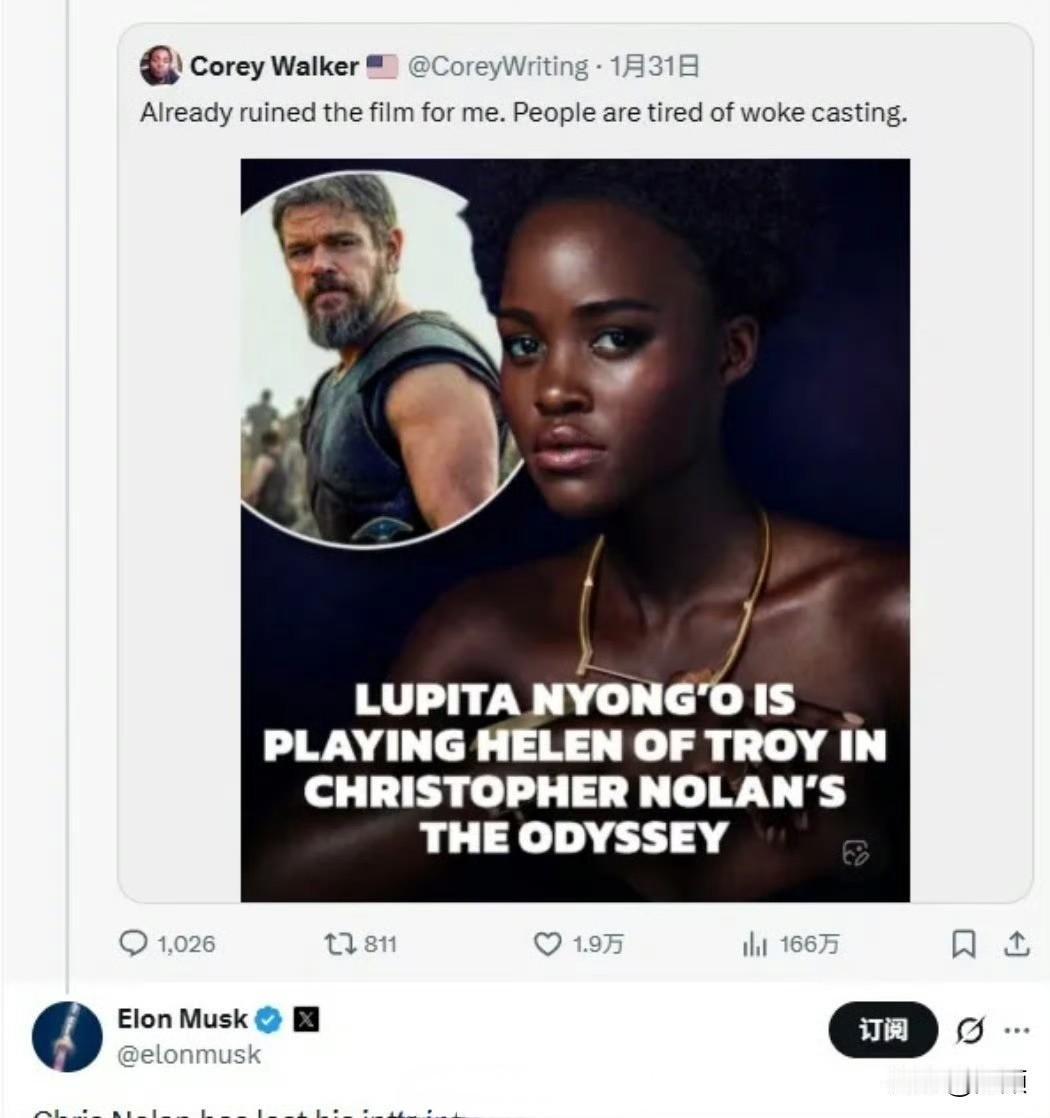 诺兰新片《奥德赛》官宣,黑人女星露皮塔·尼永奥饰演引发特洛伊战争的绝世美女海伦,2.5亿预算的大制作,直接引爆欧美网友骂战,连马斯克都下场批评诺兰“政治正确过头”。 网友吵翻:有人骂“选角离谱,违背史诗设定”,有人怼“种族刻板印象该打破”。 我倒觉得,与其争肤色,不如期待诺兰怎么拍。毕竟我连《罗密欧与猪刚鬣》这种“恐怖片”都能看,这点改编算啥~再或者片名改叫:本田奥德赛,这样说不定有一些车迷冲片名去看