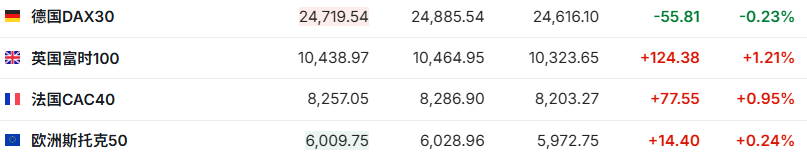 2.截至发稿,德国DAX指数跌0.23%,英国富时100指数涨1.21%,法国CAC40指数涨0.95%,欧洲斯托克50指数涨0.24%。