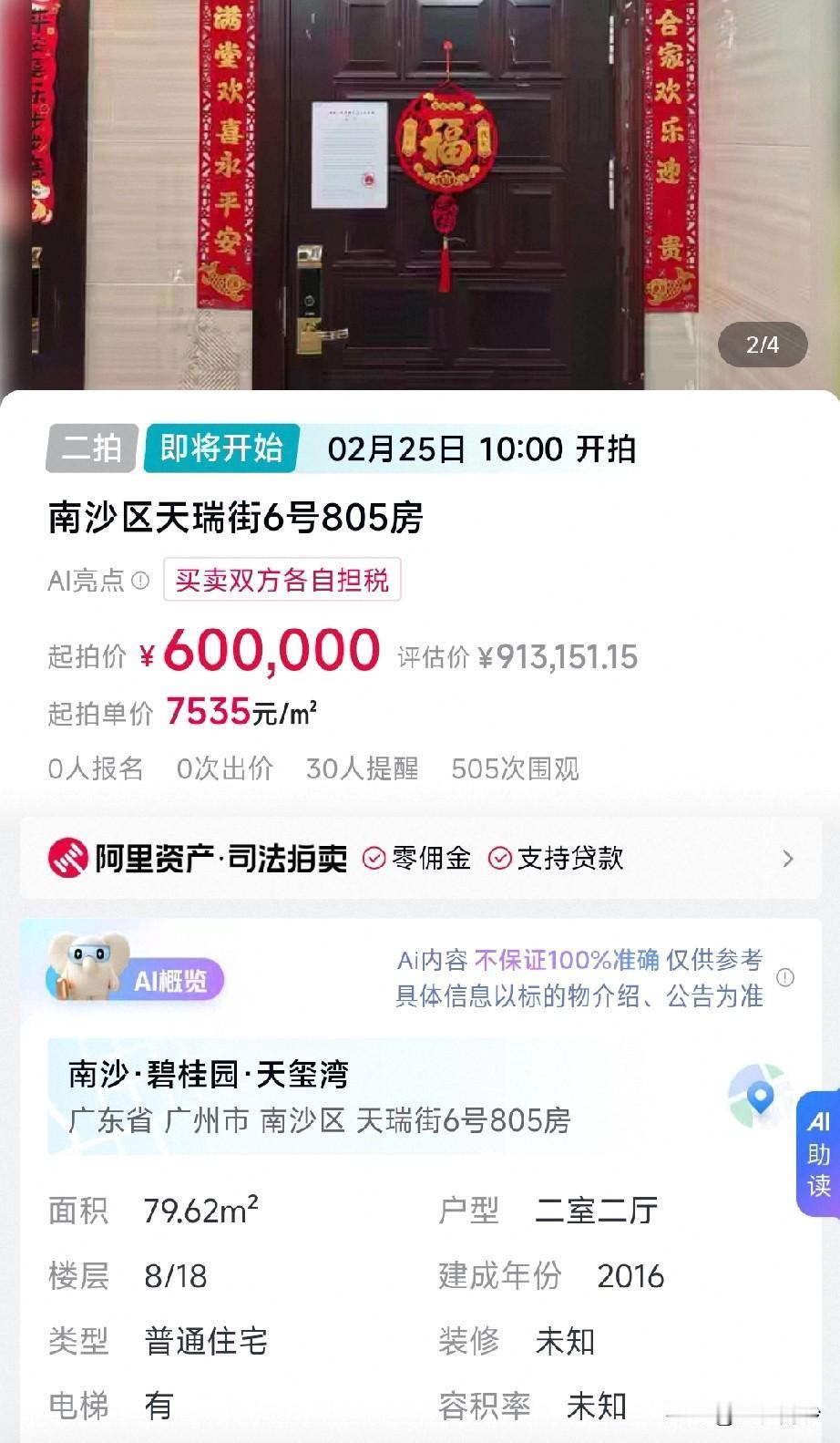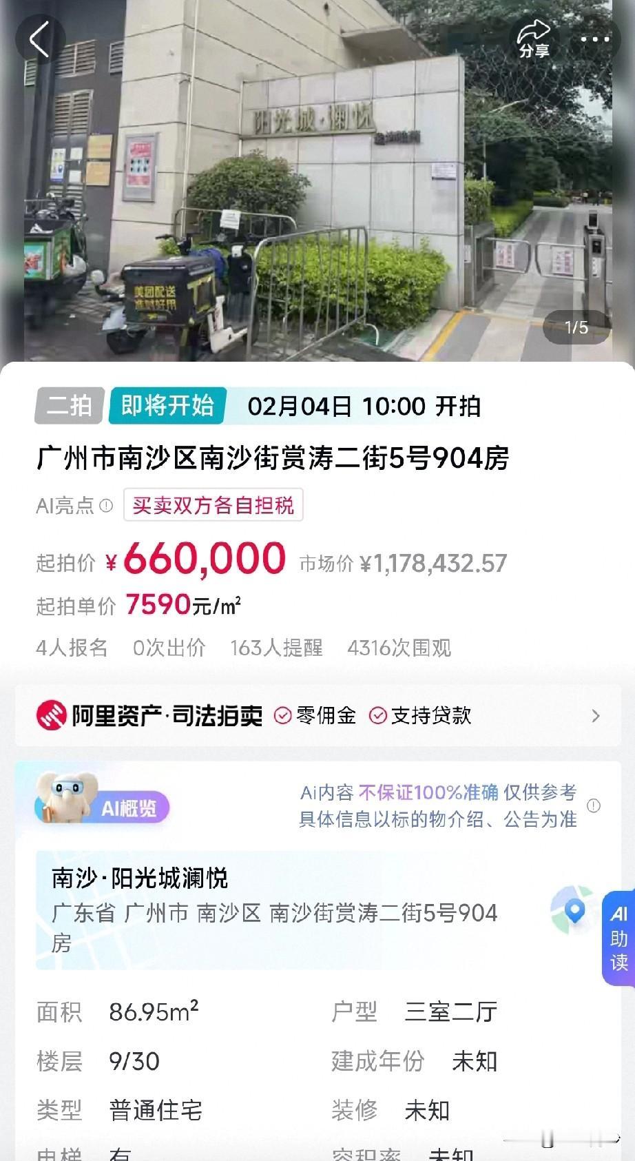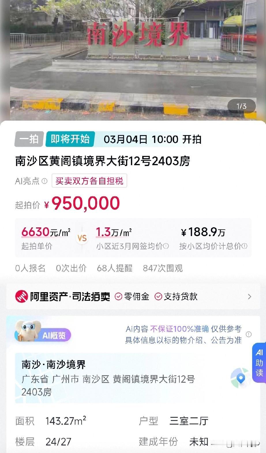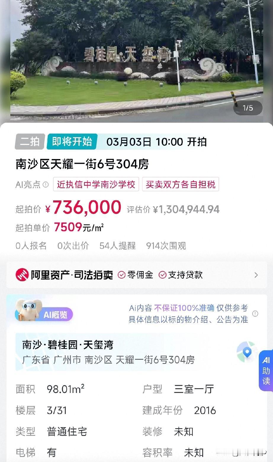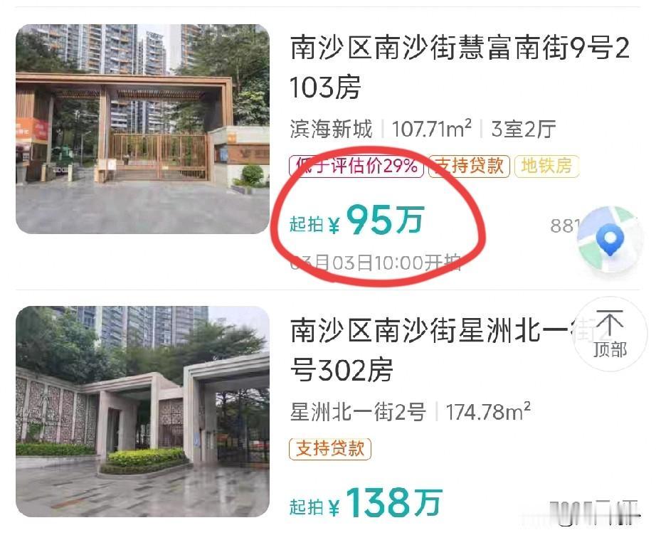 【南沙法拍】前几天被一套星河丹堤的商拍忽悠了一下,又再次刷起了法拍房,发现南沙的法拍房貌似价格又下探了,基本上100w 的总价,选都选不过来。 最明显的,滨海新城基本上100w内都有好多套,各种户型各种楼层。有部分装修保养都很不错,甚至还有全新未入住的。 第二个笋的应该是天玺湾了,基本上起拍价70几万就有,最低有一套二房的只要60万。如果想要第一算上车大社区,大园林,而且名校加持的,天玺湾绝对是捡漏的不二之选。 另外别以为蕉门上车很贵,南沙境界也是法拍不错的低价选择,一套143方的大三房,起拍价只要95万,这还是一拍的状态,不比某悦府要笋多了? 最后就是阳光城澜悦了,一套三房的起拍只要66万,折单价只要7千多,重要的是次新房,带装修,这可比引发几百人看房,就在隔壁的逸涛雅苑四期要省事多了?