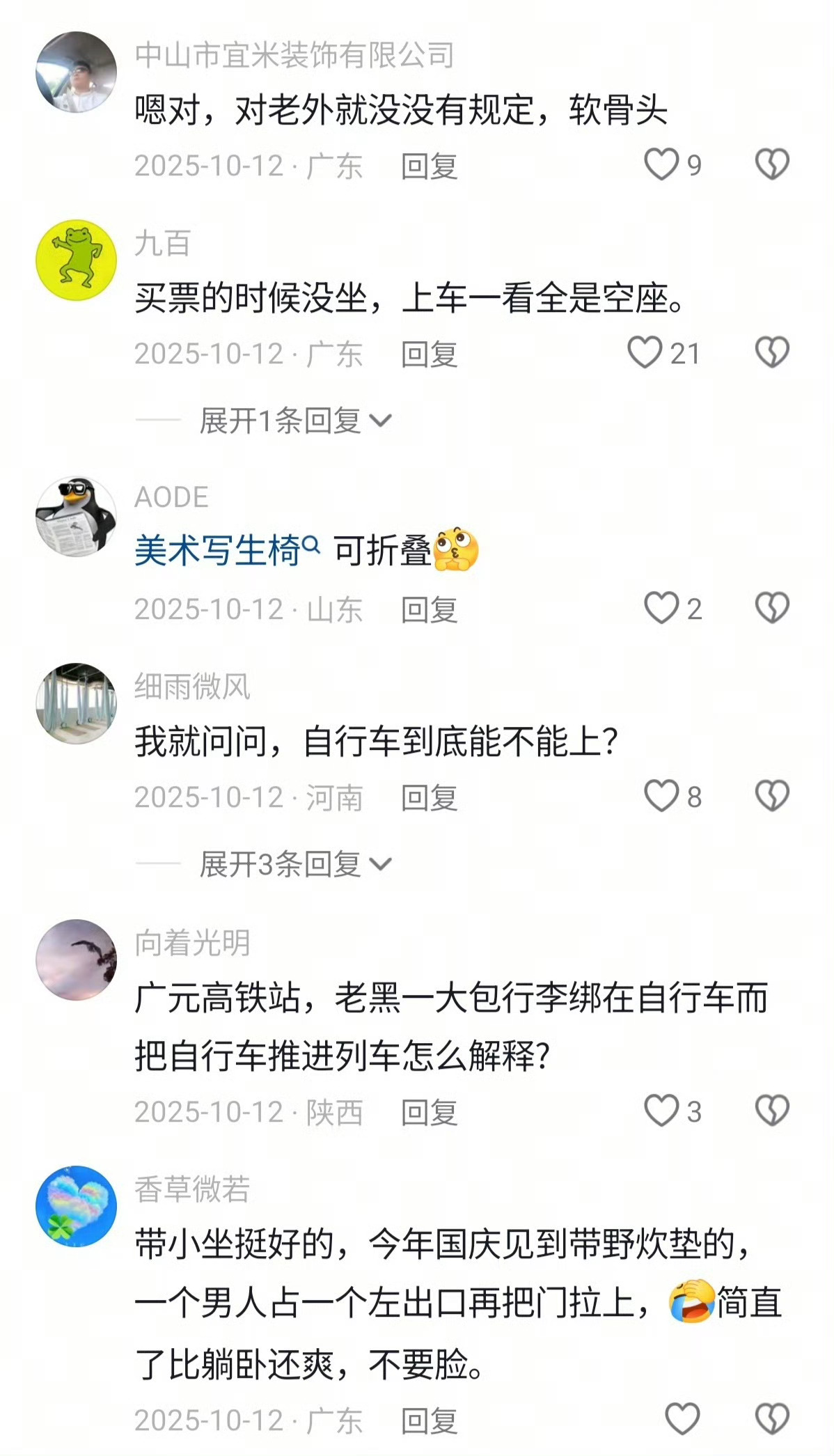 12306回应男子自带折叠椅坐高铁看高铁规定,我觉得如果规定允许的话,买无座票的时候,能够自己带一个折叠椅,肯定是更好的,毕竟一路站着挺累的,虽然无座票是可以择机去乘坐没有人坐的座位,但是春运期间基本上都是坐满的状况,如果能自带座椅的话,在不影响他的情况下,也能够得到有效的休息。