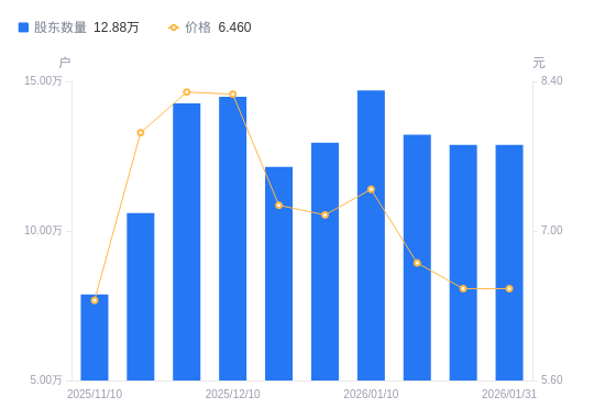 日期A股户数(户)流通A股户均持股数(股)户均持股市值(万元)2026-01-3112879010068.606.502026-01-3012879010068.606.502026-01-201321899809.716.572026-01-101469988821.456.522025-12-3112954710009.777.162025-12-201214529599.636.952025-12-101448268050.316.672025-11-301426828171.286.782025-11-2010599810999.218.712025-11-107877014801.259.40