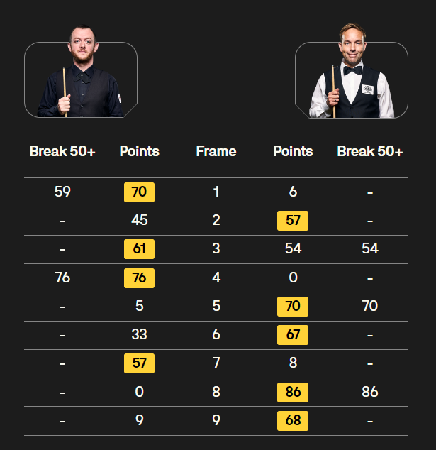艾伦上半场取得3-1领先,休息归来,卡特追至3-3;艾伦先到赛点,卡特再次顽强扳平,双方鏖战至决胜局,最终卡特抓住机会以5-4的总比分战胜艾伦晋级下一轮。