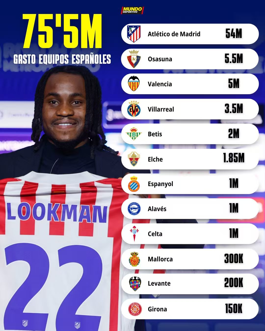 从具体数据来看,马竞一家就贡献了西甲冬窗超过70%的投入(约5400万欧元),而其他球队的引援预算普遍不足1000万欧元。