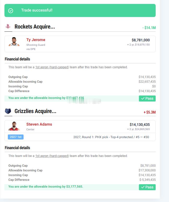 如果出亚当斯+27太阳签,换杰罗姆的话,这个交易显然成立,而且,还能把超税金额缩减到144w,甚至再稍微努把力,弄不好就可以避税。