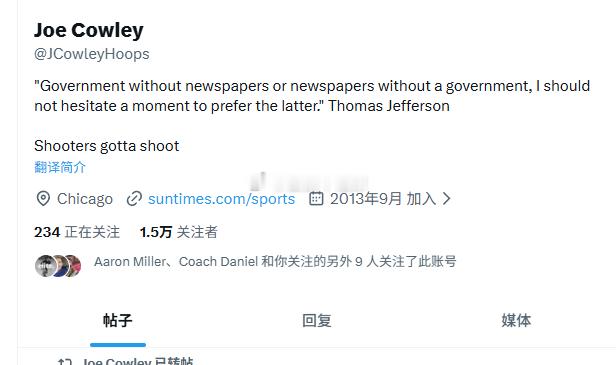 图3-图5,SleeperRockets这个账号,就是个自媒体,跟平时微博上搞搬运的账号差不多,就是那种四处看消息然后汇总发出来那种账号,据他说,Joe Cowley这个人说,公牛强烈追求伊森被火箭拒绝。那这人是谁呢,《芝加哥太阳时报》 (Chicago Sun-Times) 的体育版记者,风城当地人。但,芝加哥最知名的报纸明明是Chicago Daily Tribune《芝加哥论坛报》,太阳时报跟本没听说过。