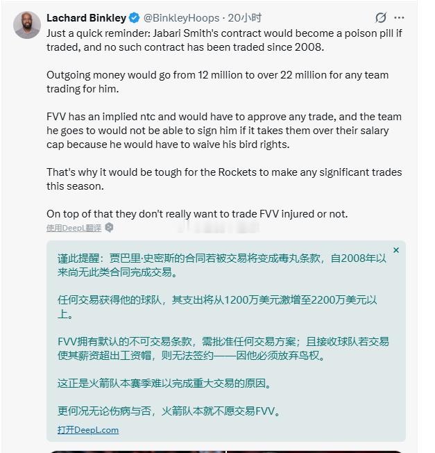 图6-图7,Lachard Binkley,这位是正经八百的火箭当地持球记者,体育画报休斯顿分舵主理人,每周亮相当地电台Fox26。那他说啥呢,反正大意就一句,火箭本赛季难以完整重大交易。