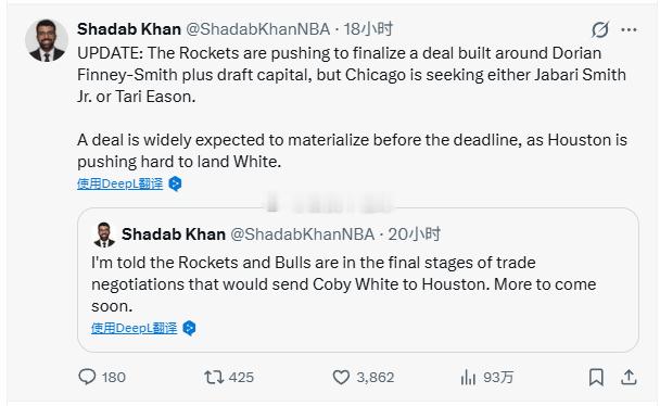 所以,综合一下以上消息源可以做出初步的判断:1. 公牛跟火箭谈白科,就是公牛积极在推,所有消息都是芝加哥的记者在说这说那...2. 火箭的记者态度都很鲜明,交易截止日火箭更可能按兵不动3. 其他消息全部扯淡