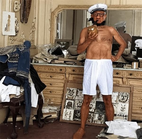 1957年,艺术大师毕加索顽童心性大起,装扮成卡通人物“大力水手”,毕加索赤裸着布满肌肉线条的上身,只穿一条宽松的白色短裤,头戴一顶白色水手帽,脸上贴了浓密的假胡子,嘴里叼着的物件模仿着大力水手标志性的烟斗,一只手叉腰、另一只手举着“烟斗”,表情带着戏谑的得意感,活脱脱把自己变成了那个爱吃菠菜的卡通硬汉。 毕加索一生都保持着对生活的戏谑与好奇,这次装扮既是对当时流行卡通的趣味玩梗,也是他跳出“严肃艺术大师”标签的随性表达,让人们看到这位天才在画布之外,充满孩子气的可爱一面。