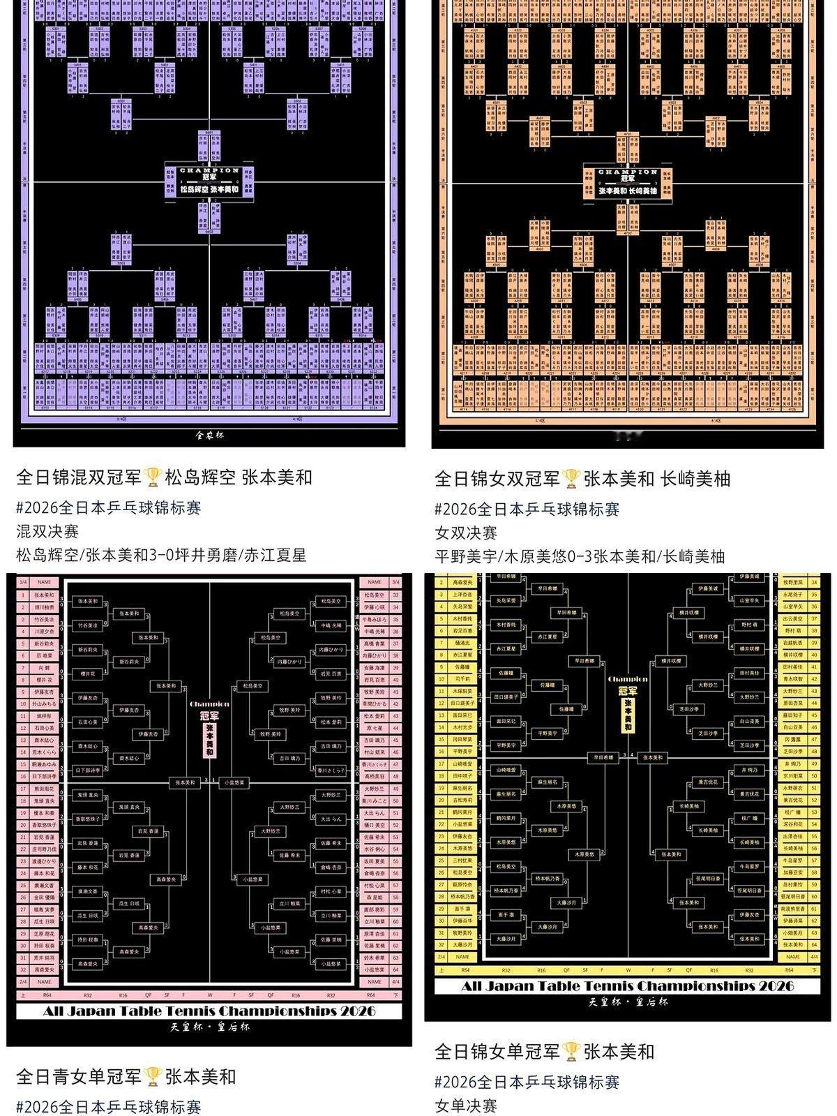 日本乒坛出了个狠角色,17岁的张本美和。 她不是来参加全日锦标赛的,她是来清场的。 女单冠军,她的。 女双冠军,她的。 混双冠军,还是她的。 最后,连青年组的女单冠军,她也顺手拿走了。 四个冠军奖杯,齐刷刷摆在她一个人面前,整个赛场安静得只听见闪光灯的声音。那些刚刚和她交过手的选手,坐在场下,眼神里已经不是不甘心,而是一种彻底的无力感。 历史上,从没有一个人能在全日锦这么干,一个人,包揽所有能参加的女子项目。 这哪是打球。 这分明是告诉所有人,一个新时代开始了,规矩,由她来定。