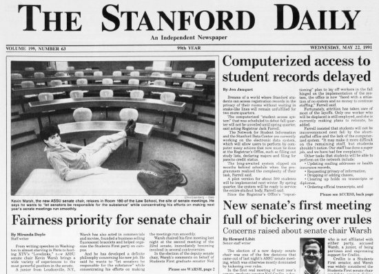 1991年5月22日,沃什登上《斯坦福日报》头版
