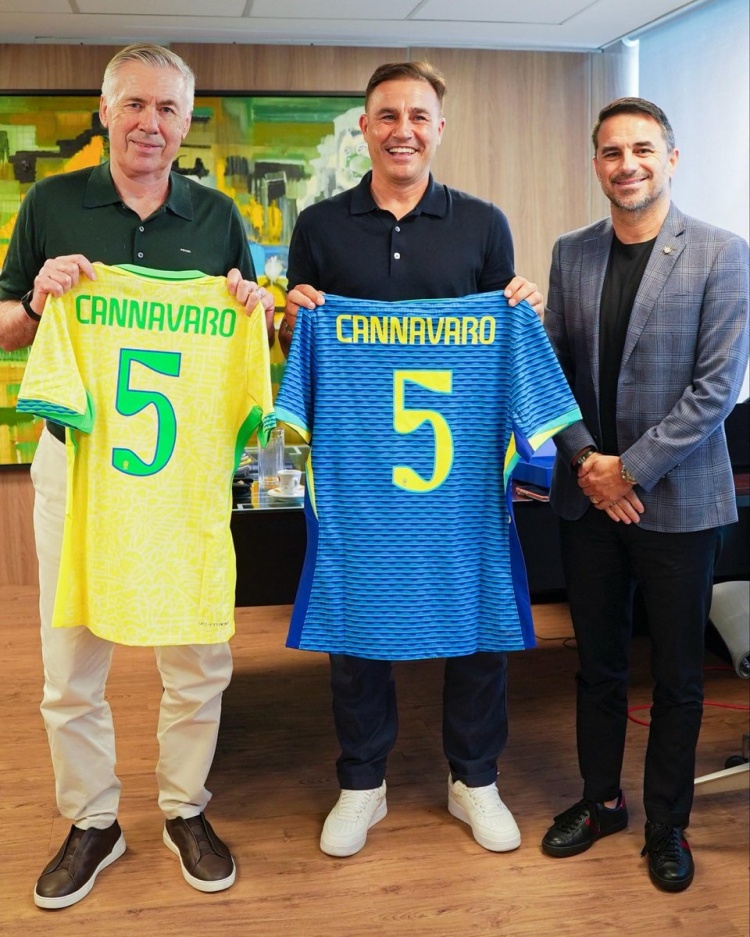 巴西足协晒照,乌兹别克斯坦主帅卡纳瓦罗造访总部与安切洛蒂合影