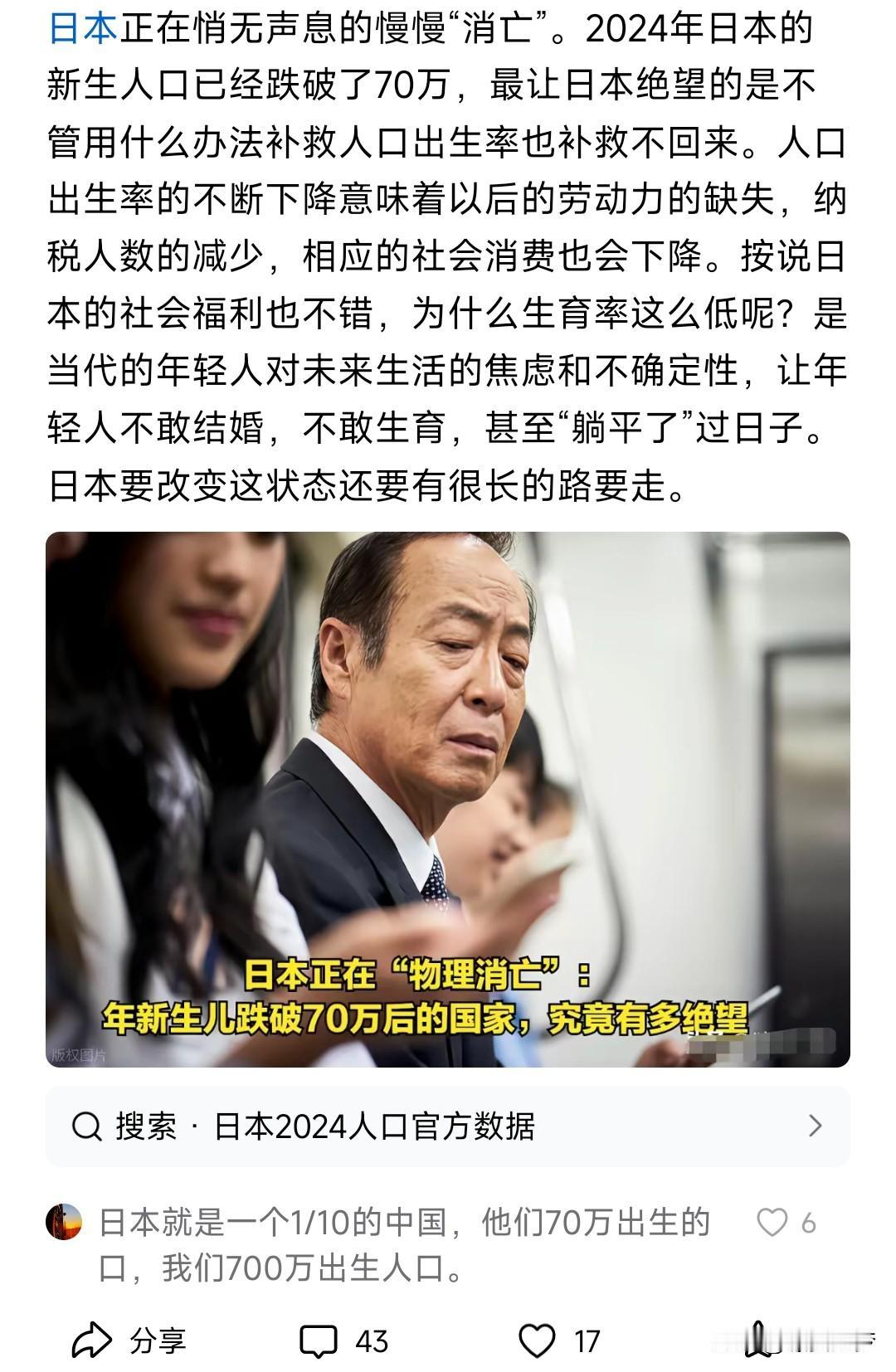 日本约三分之一的女性终生不婚不育,在这种情形下,生育率仍能维持在1.3。日本出生人口虽然不足70万,而去年引入的移民就高达40万。注意这些移民有很多都是文化人种接近的中韩越移民。实际上日本只要放宽外国移民门槛,其人口问题实际上并不是那么严重。