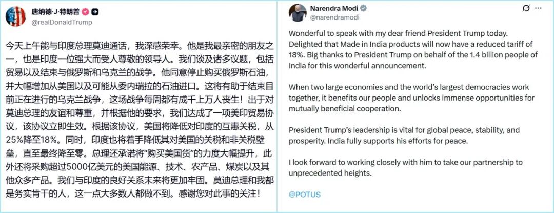 莫迪也在社交媒体上发文证实双方达成协议,称“印度制造产品的关税将降至18%”。但对美国商品采购和石油问题避而不谈。印度商业和工业部长戈亚尔(PiyushGoyal)则称,这项协议将使美国和印度的经济更加紧密地联系在一起。
