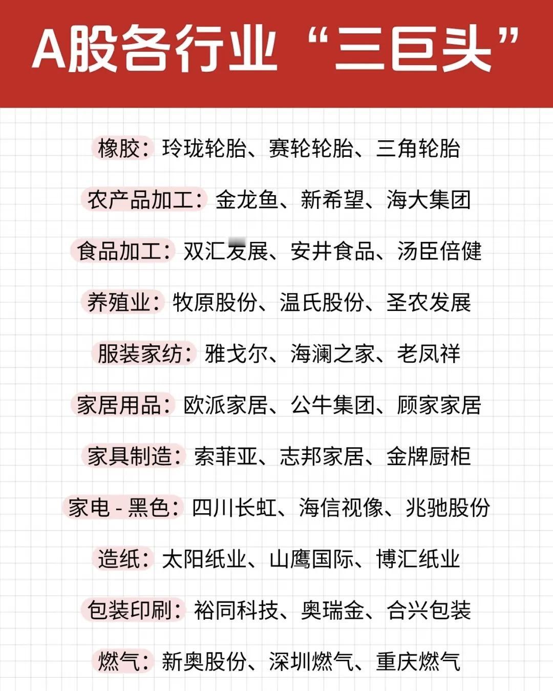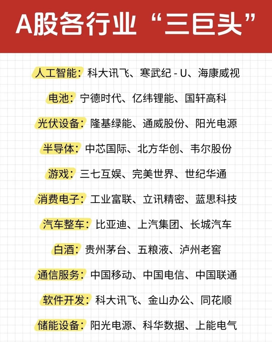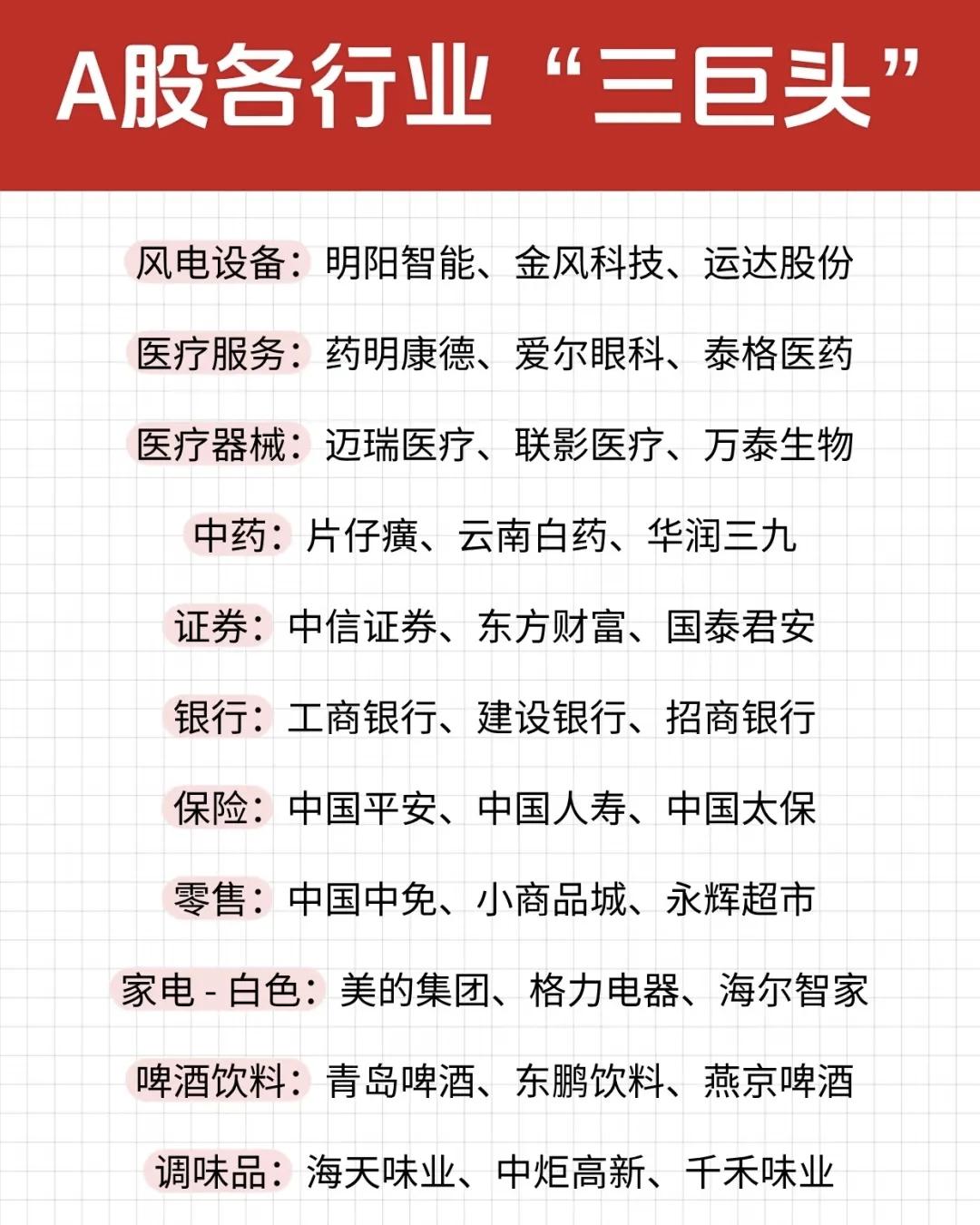 🔥A股各行业三巨头全梳理!覆盖新能源、消费、金融、制造等核心赛道精准锁定核心赛
