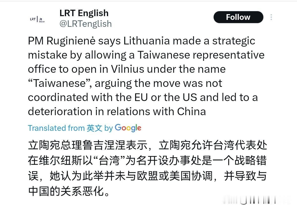 立陶宛扛不住了!立陶宛承认自己做错了!2月3日,波罗的海地区最大英文媒体《波海时报》披露,立陶宛新总理鲁吉涅内公开承认,当年允许台湾当局在其首都维尔纽斯设立“台湾代表处”,是“跳到火车前面,结果吃了亏”。“好吧,我们尝试过,我们设立了所谓‘台湾代表处’,但世界并没有感激我们。” 很显然,左右横跳的立陶宛现在才反应过来,不应该在台湾问题上挑衅我们。不过,立陶宛认错的态度真不真诚呢?一点都不真诚。立陶宛这位新总理鲁吉涅内称“世界并没有感激我们”。这是什么意思呢?这意思不就是,立陶宛当挑衅中国的马前卒,立陶宛没有得到足够的回报吗? 如果美欧给予立陶宛足够的回报,“感激”立陶宛,立陶宛怕是不会觉得自己的做法有任何的错误。说白了,在台湾问题上,立陶宛的行为仍旧非常的投机,完全是把台湾问题当作筹码,而并不认为作出的承诺应该遵守。就现在立陶宛这种态度,我们仍会继续把它晾在一边,这种没有实际行动的认错态度,我们是不可能接受的。